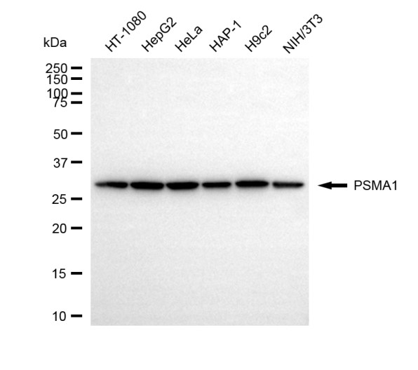 Western blotting analysis using PSMA1 antibody. Total cell lysates (30 μg) from various cell lines were loaded and separated by SDS-PAGE. The blot was incubated with PSMA1 antibody and HRP-conjugated goat anti-rabbit secondary antibody respectively.
