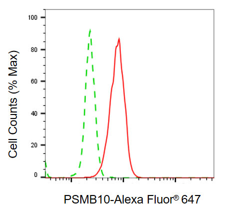 Flow cytometric analysis of PSMB10 expression in HAP-1 cells using PSMB10 antibody. Green, isotype control; red, PSMB10.