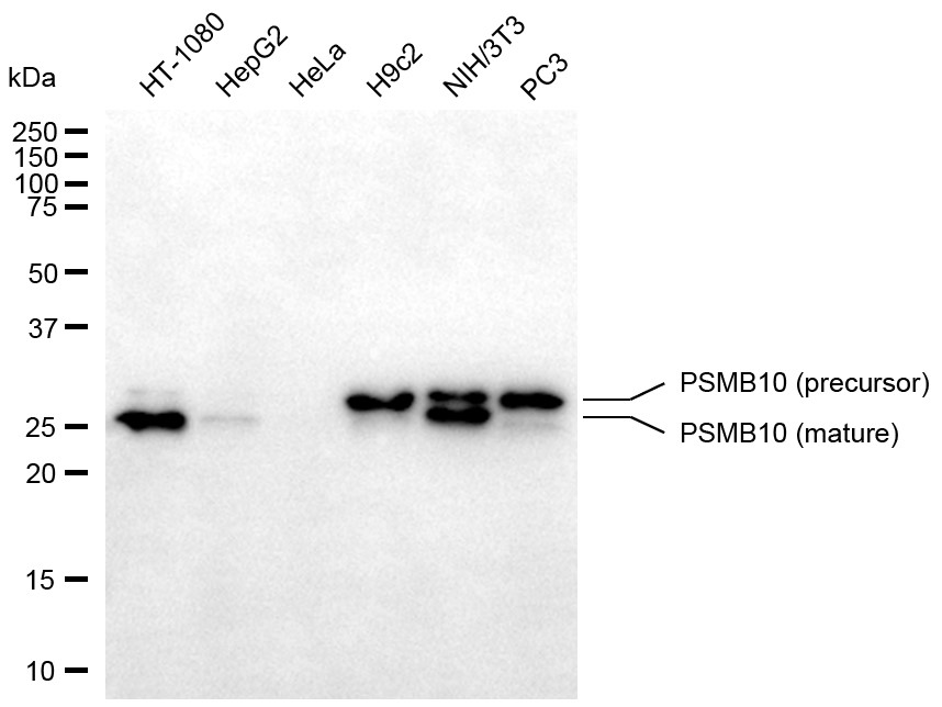 Western blotting analysis using PSMB10 antibody. Total cell lysates (30 μg) from various cell lines were loaded and separated by SDS-PAGE. The blot was incubated with PSMB10 antibody and HRP-conjugated goat anti-rabbit secondary antibody respectively.