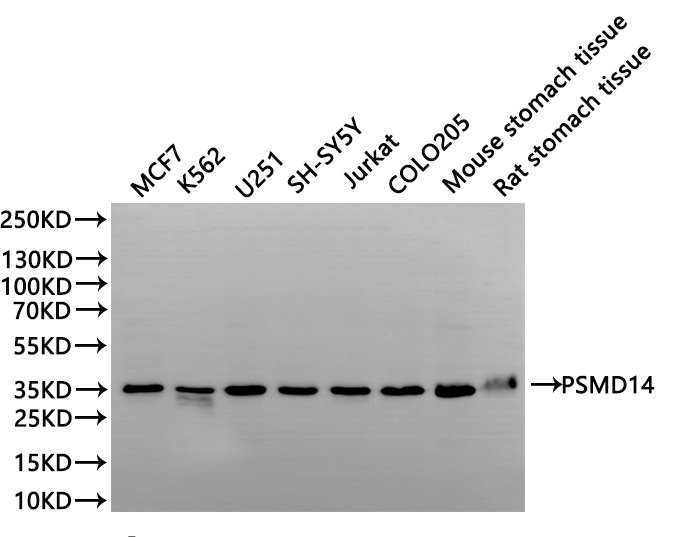 Positive WB detected in: MCF7 whole cell lysate(30μg), K562 whole cell lysate(30μg), U251 whole cell lysate(30μg), SH-SY5Y whole cell lysate(30μg), Jurkat whole cell lysate(30μg), COLO205 whole cell lysate(30μg), Mouse stomach tissue lysate(30μg), Rat stomach tissue lysate(30μg)