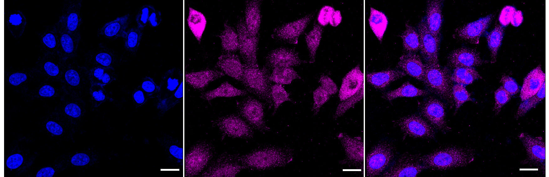 Immunocytochemical staining of HepG2 cells with PSMD4 antibody. Nuclei were stained blue with DAPI; PSMD4 was stained magenta with Alexa Fluor? 647. Images were taken using Leica stellaris 5. Protein abundance based on laser Intensity and smart gain: Medium. Scale bar: 20 μm.
