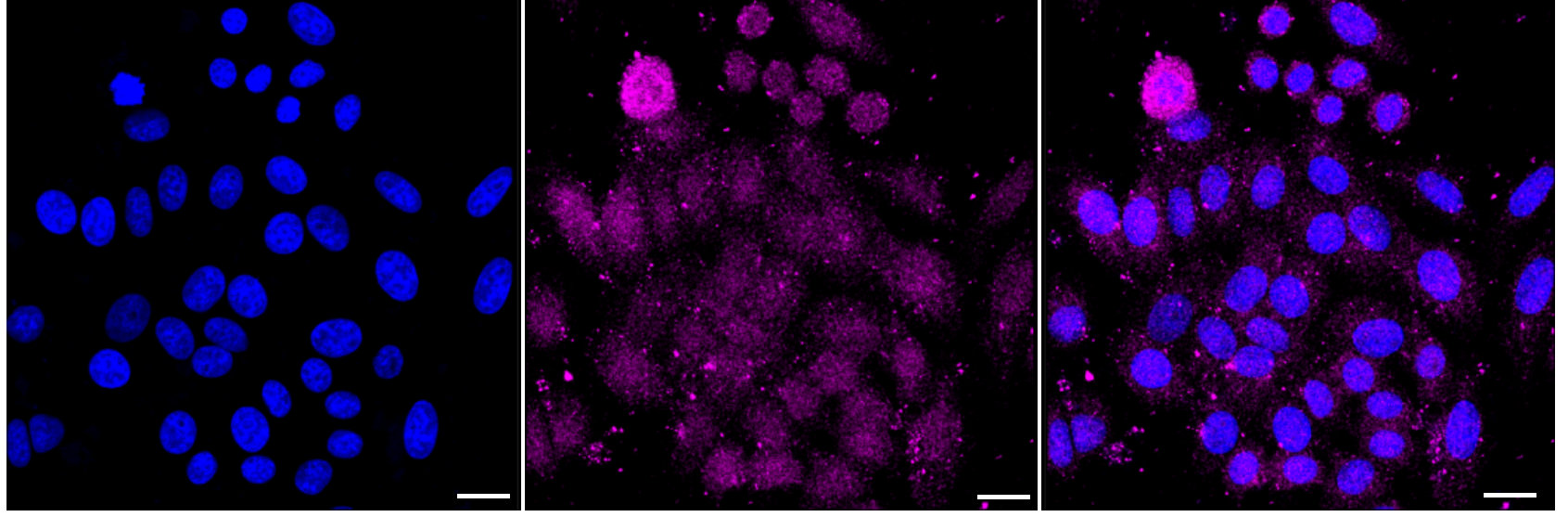 Immunocytochemical staining of HepG2 cells with PTEN antibody. Nuclei were stained blue with DAPI; PTEN was stained magenta with Alexa Fluor? 647. Images were taken using Leica stellaris 5. Protein abundance based on laser Intensity and smart gain: Medium. Scale bar: 20 μm.