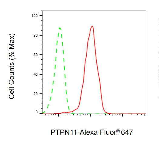 Flow cytometric analysis of PTPN11 expression in HepG2 cells using PTPN11 antibody. Green, isotype control; red, PTPN11.