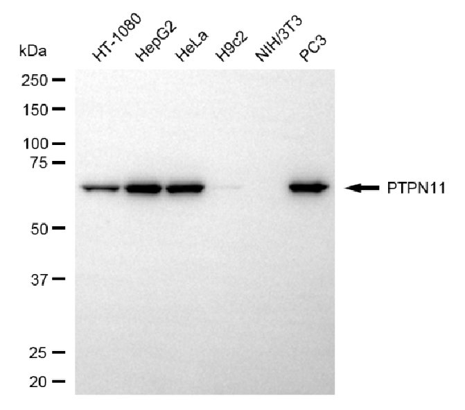 Western blotting analysis using PTPN11 antibody. Total cell lysates (30 μg) from various cell lines were loaded and separated by SDS-PAGE. The blot was incubated with PTPN11 antibody and HRP-conjugated goat anti-rabbit secondary antibody respectively.