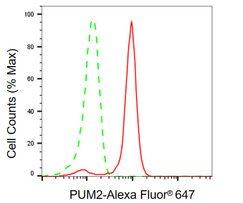 Flow cytometric analysis of PUM2 expression in H9c2 cells using PUM2 antibody. Green, isotype control; red, PUM2.