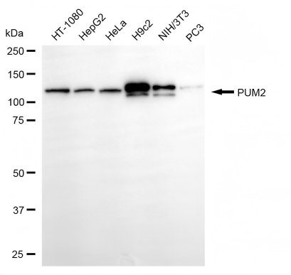 Western blotting analysis using PUM2 antibody. Total cell lysates (30 μg) from various cell lines were loaded and separated by SDS-PAGE. The blot was incubated with PUM2 antibody and HRP-conjugated goat anti-rabbit secondary antibody respectively.