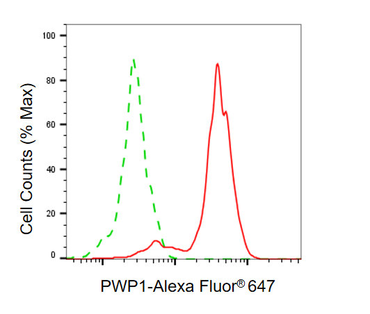 Flow cytometric analysis of PWP1 expression in HeLa cells using PWP1 antibody. Green, isotype control; red, PWP1.