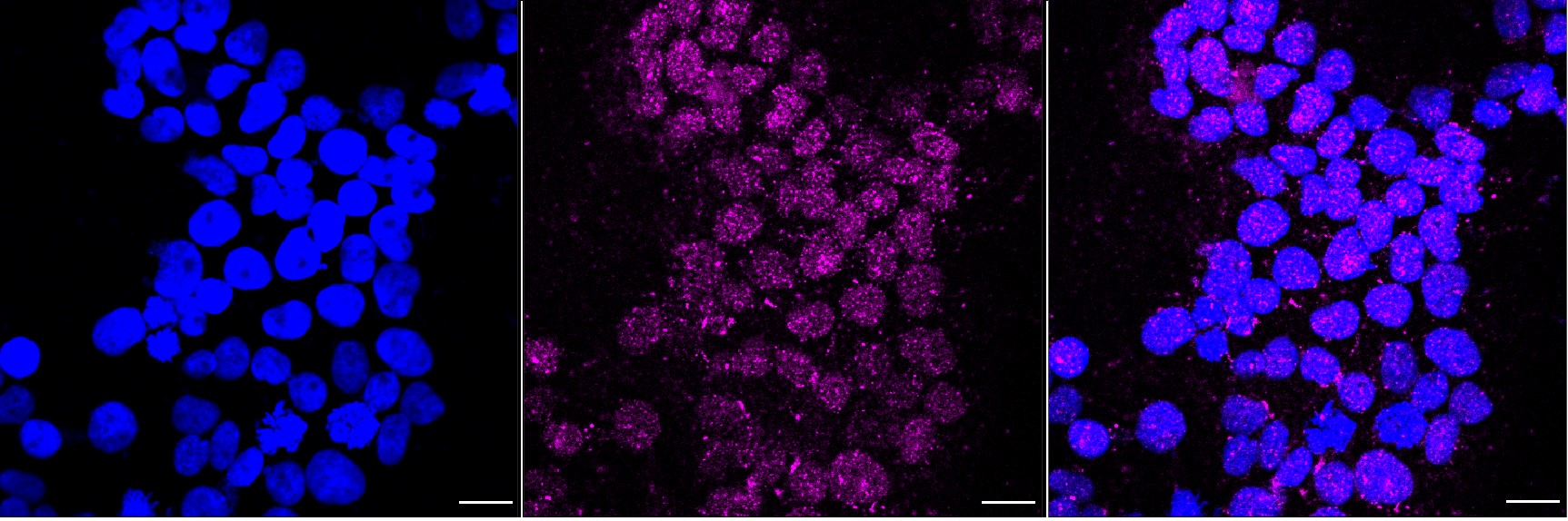 Immunocytochemical staining of Hela cells with PWP1 antibody. Nuclei were stained blue with DAPI; PWP1 was stained magenta with Alexa Fluor? 647. Images were taken using Leica stellaris 5. Protein abundance based on laser Intensity and smart gain: Medium. Scale bar, 20 μm.