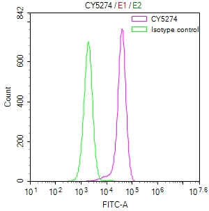 Overlay Peak curve showing HepG2 cells stained with CSB-RA017450A0HU (red line) at 1:50. The cells were fixed in 4% formaldehyde and permeated by 0.2% TritonX-100. Then 10% normal goat serum to block non-specific protein-protein interactions followed by the antibody (1μg/1*106cells) for 45min at 4℃. The secondary antibody used was FITC-conjugated Goat Anti-rabbit IgG(H+L) at 1:200 dilution for 35min at 4℃.Control antibody (green line) was rabbit IgG (1μg/1*106cells) used under the same conditions. Acquisition of >10,000 events was performed.