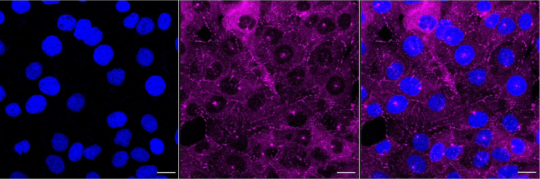 Immunocytochemical staining of HT-1080 cells with Paxillin antibody. Nuclei were stained blue with DAPI; Paxillin was stained magenta with Alexa Fluor? 647. Images were taken using Leica stellaris 5. Protein abundance based on laser Intensity and smart gain: High. Scale bar, 20 μm.
