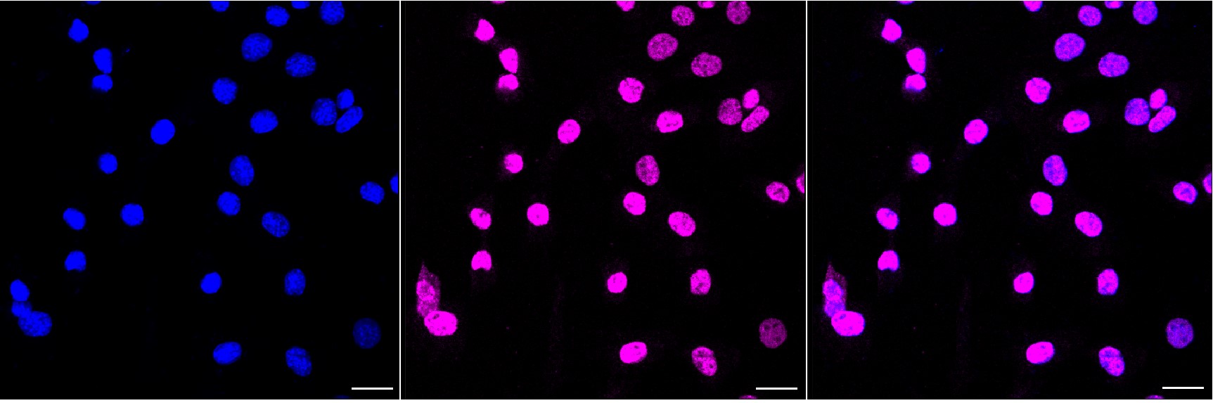 Immunocytochemical staining of C2C12 cells with QKI antibody. Nuclei were stained blue with DAPI; QKI was stained magenta with Alexa Fluor? 647. Images were taken using Leica stellaris 5. Protein abundance based on laser Intensity and smart gain: Medium. Scale bar, 20 μm.