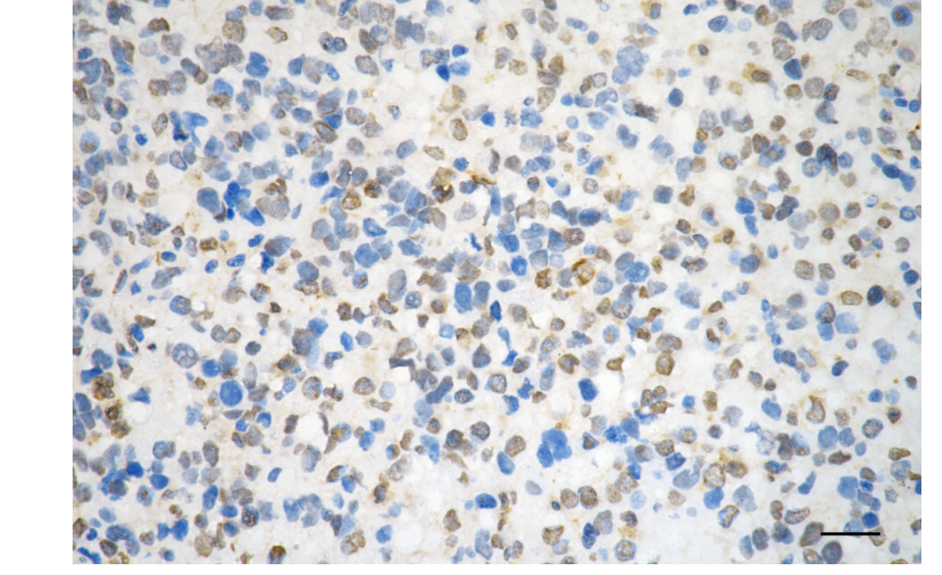 Immunohistochemistry was performed on paraffin-embedded human glioblastoma using QKI antibody. Antigen retrieval was done in sodium citrate buffer (pH 6.0). DAB was used for detection, with hematoxylin counterstaining. Images were acquired using a Nikon Ci-L Plus microscope (40× objective). Scale bar: 25 μm.