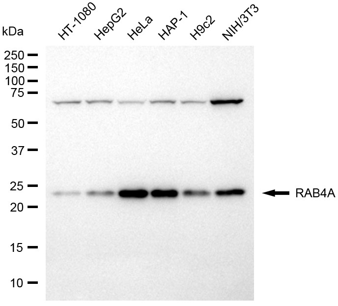 Western blotting analysis using RAB4A antibody. Total cell lysates (30 μg) from various cell lines were loaded and separated by SDS-PAGE. The blot was incubated with RAB4A antibody and HRP-conjugated goat anti-rabbit secondary antibody respectively.
