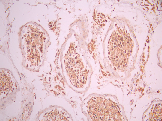 IHC image of CSB-RA990431A0HU diluted at 1:100 and staining in paraffin-embedded human testis tissue performed on a Leica BondTM system. After dewaxing and hydration, antigen retrieval was mediated by high pressure in a citrate buffer (pH 6.0). Section was blocked with 10% normal goat serum 30min at RT. Then primary antibody (1% BSA) was incubated at 4°C overnight. The primary is detected by a Goat anti-rabbit polymer IgG labeled by HRP and visualized using 0.05% DAB.
