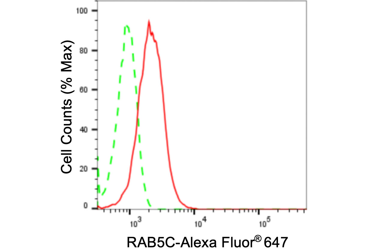 Flow cytometric analysis of RAB5C expression in HepG2 cells using RAB5C antibody. Green, isotype control; red, RAB5C.