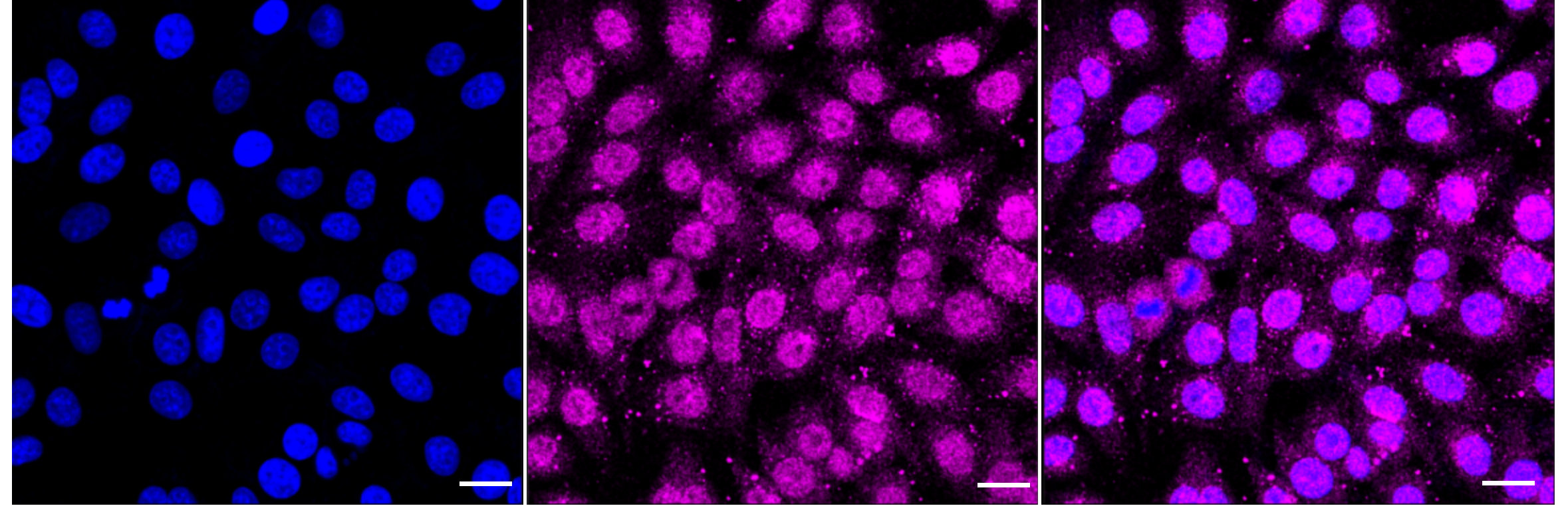 Immunocytochemical staining of HepG2 cells with RAB5C antibody. Nuclei were stained blue with DAPI; RAB5C was stained magenta with Alexa Fluor? 647. Images were taken using Leica stellaris 5. Protein abundance based on laser Intensity and smart gain: Medium. Scale bar: 20 μm.