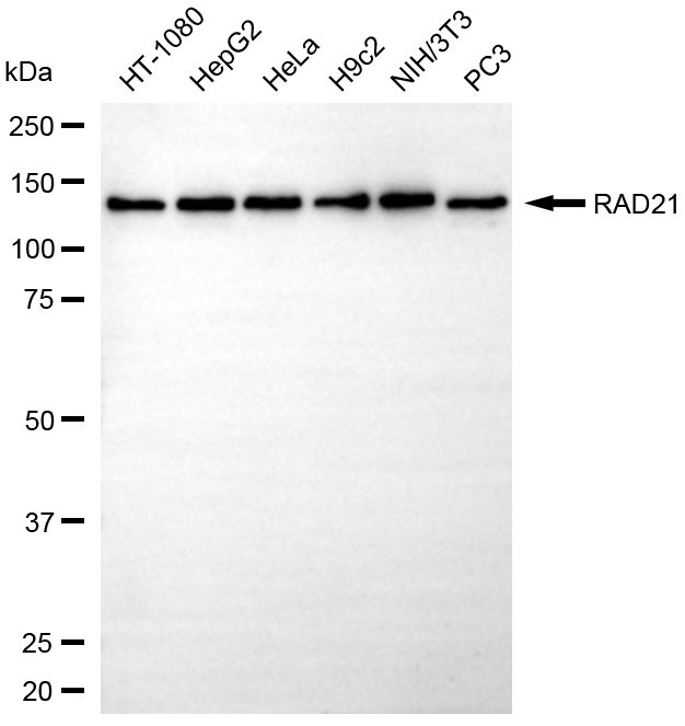 Western blotting analysis using RAD21 antibody. Total cell lysates (30 μg) from various cell lines were loaded and separated by SDS-PAGE. The blot was incubated with RAD21 antibody and HRP-conjugated goat anti-rabbit secondary antibody respectively.
