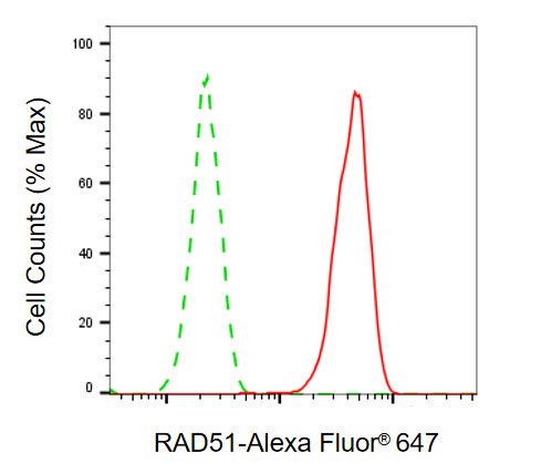 Flow cytometric analysis of RAD51 expression in HAP-1 cells using RAD51 antibody. Green, isotype control; red, RAD51.