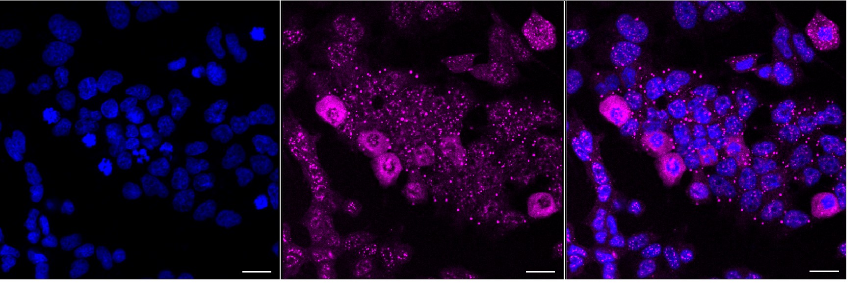Immunocytochemical staining of HeLa cells with Phospho-Raf1 (S621) antibody. Nuclei were stained blue with DAPI; Phospho-Raf1 (S621) was stained magenta with Alexa Fluor? 647. Images were taken using Leica stellaris 5. Protein abundance based on laser Intensity and smart gain: High. Scale bar, 20 μm.