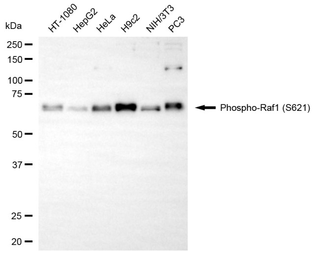 Western blotting analysis using phospho-Raf1 (S621) antibody. Total cell lysates (30 μg) from various cell lines were loaded and separated by SDS-PAGE. The blot was incubated with phospho-Raf1 (S621) antibody and HRP-conjugated goat anti-rabbit secondary antibody respectively.