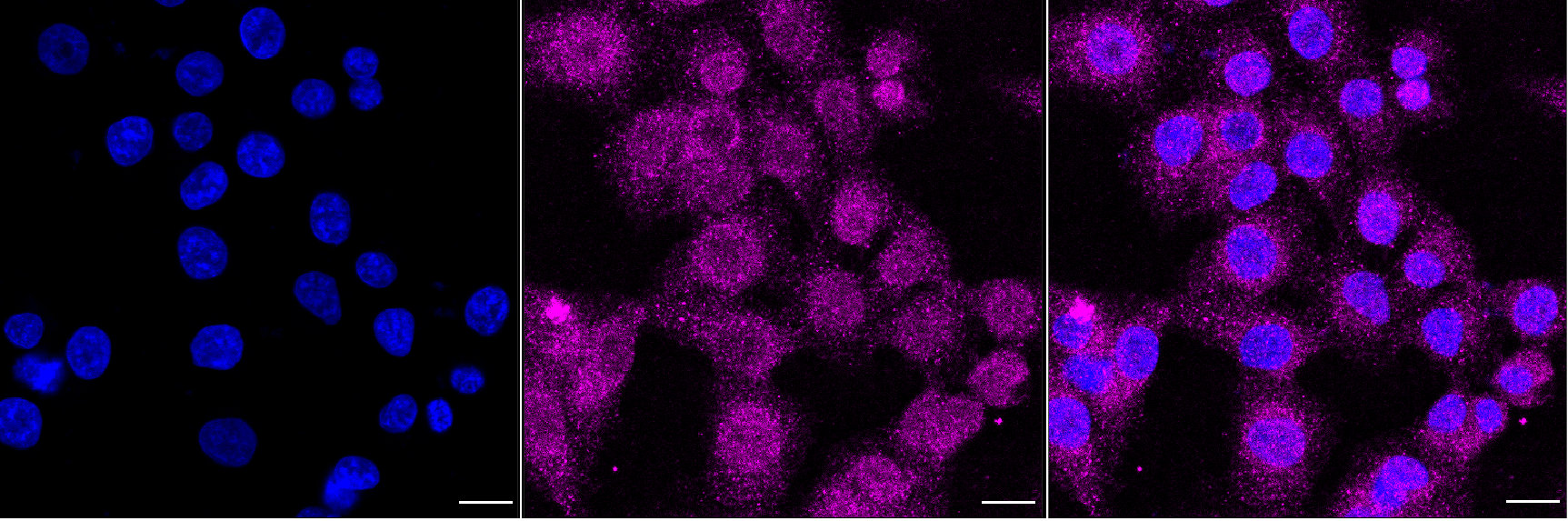 Immunocytochemical staining of HT-1080 cells with retinoic acid receptor alpha antibody. Nuclei were stained blue with DAPI; Retinoic acid receptor alpha was stained magenta with Alexa Fluor? 647. Images were taken using Leica stellaris 5. Protein abundance based on laser Intensity and smart gain: Medium. Scale bar, 20 μm.