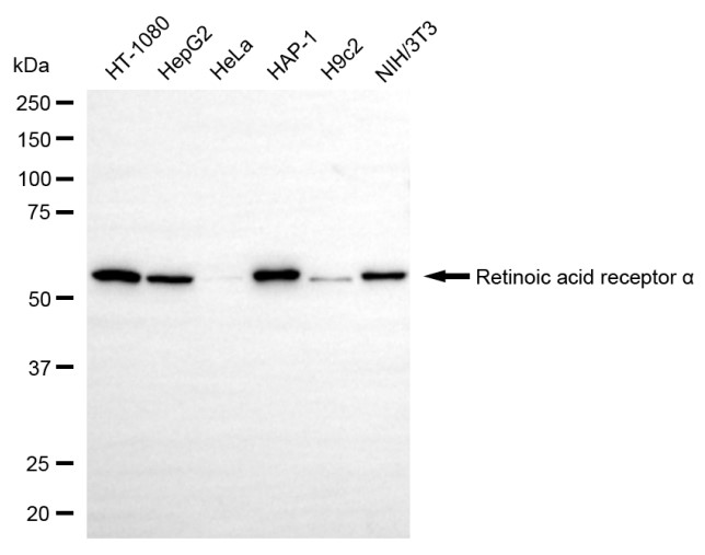 Western blotting analysis using retinoic acid receptor alpha antibody. Total cell lysates (30 μg) from various cell lines were loaded and separated by SDS-PAGE. The blot was incubated with retinoic acid receptor alpha antibody and HRP-conjugated goat anti-rabbit secondary antibody respectively.