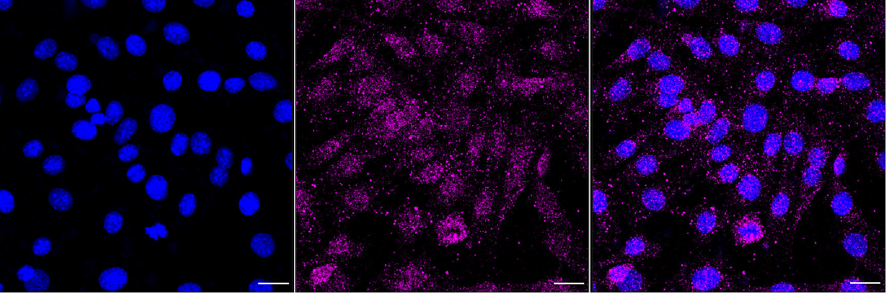 Immunocytochemical staining of C2C12 cells with RAS p21 protein activator 1 antibody. Nuclei were stained blue with DAPI; RAS p21 protein activator 1 was stained magenta with Alexa Fluor? 647. Images were taken using Leica stellaris 5. Protein abundance based on laser Intensity and smart gain: Low. Scale bar, 20 μm.