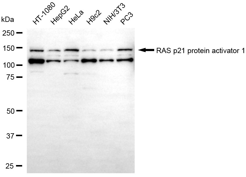 Western blotting analysis using RAS p21 protein activator 1 antibody. Total cell lysates (30 μg) from various cell lines were loaded and separated by SDS-PAGE. The blot was incubated with RAS p21 protein activator 1 antibody and HRP-conjugated goat anti-rabbit secondary antibody respectively.