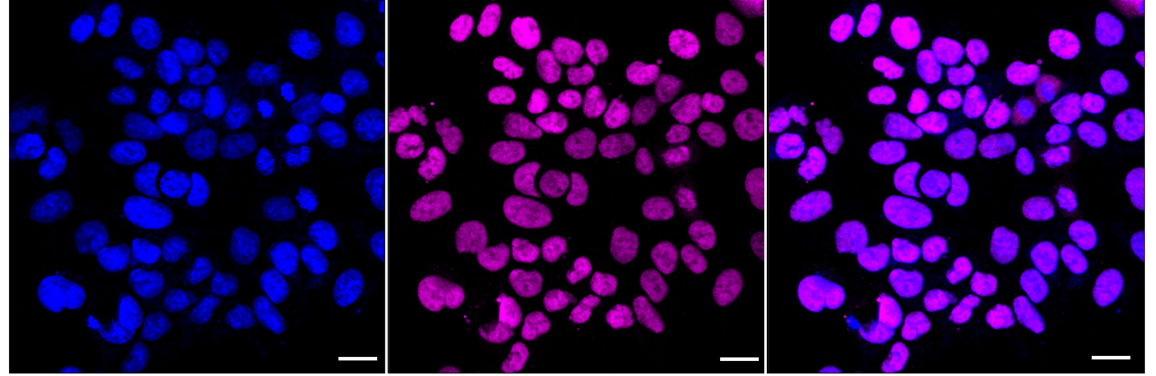 Immunocytochemical staining of HAP-1 cells with phospho-retinoblastoma (S807) antibody. Nuclei were stained blue with DAPI; Phospho-retinoblastoma (S807) was stained magenta with Alexa Fluor? 647. Images were taken using Leica stellaris 5. Protein abundance based on laser Intensity and smart gain: High. Scale bar: 20 μm.