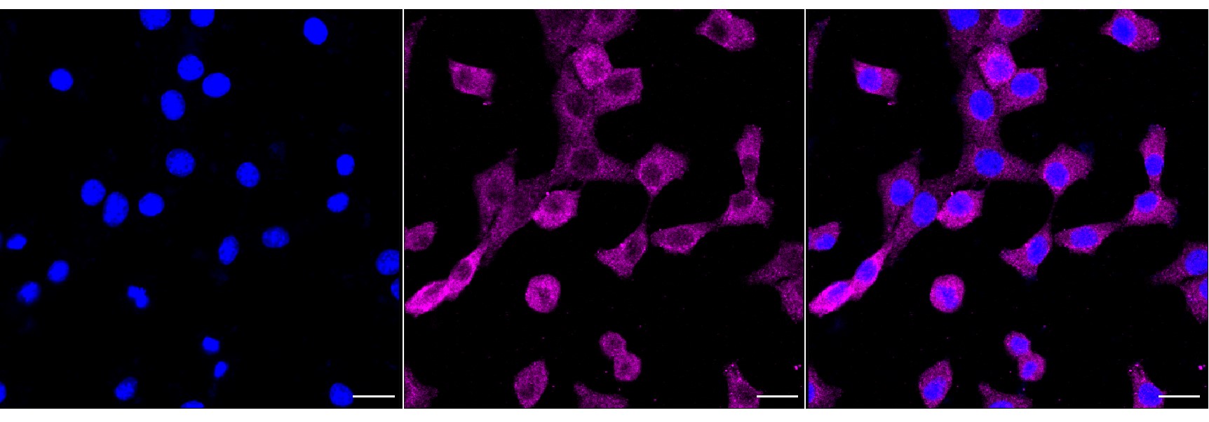 Immunocytochemical staining of C2C12 cells with RELB antibody. Nuclei were stained blue with DAPI; RELB was stained magenta with Alexa Fluor? 647. Images were taken using Leica stellaris 5. Protein abundance based on laser Intensity and smart gain: Medium. Scale bar, 20 μm.