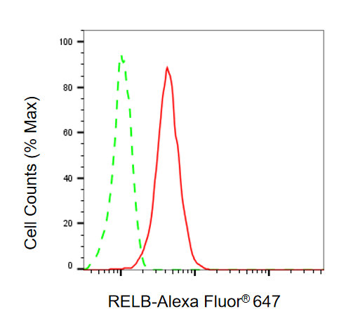 Flow cytometric analysis of RELB expression in C2C12 cells using RELB antibody. Green, isotype control; red, RELB.