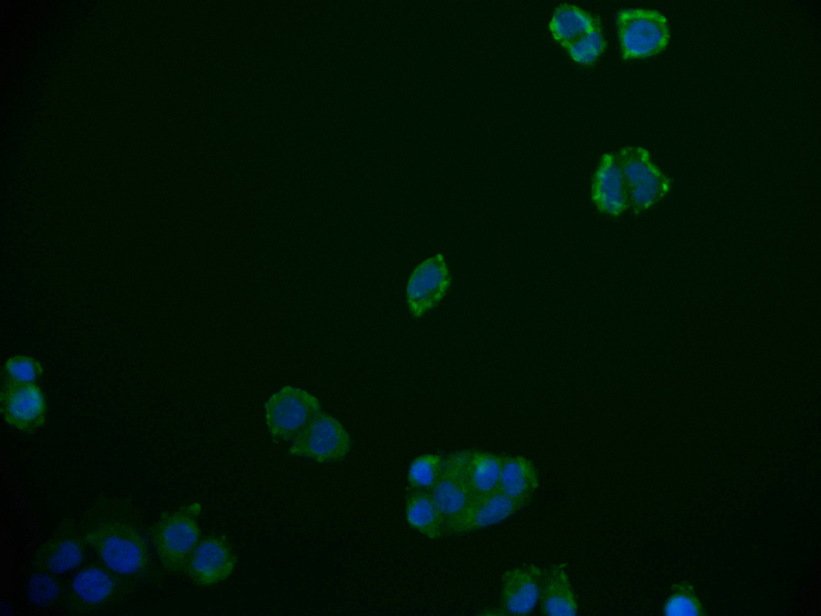 Immunofluorescence staining of PC-3 cell with CSB-RA253226A0HU at 1:50, counter-stained with DAPI. The cells were fixed in 4% formaldehyde and blocked in 10% normal Goat Serum. The cells were then incubated with the antibody overnight at 4°C. The secondary antibody was Alexa Fluor 592-congugated AffiniPure Goat Anti-Rabbit IgG(H+L).