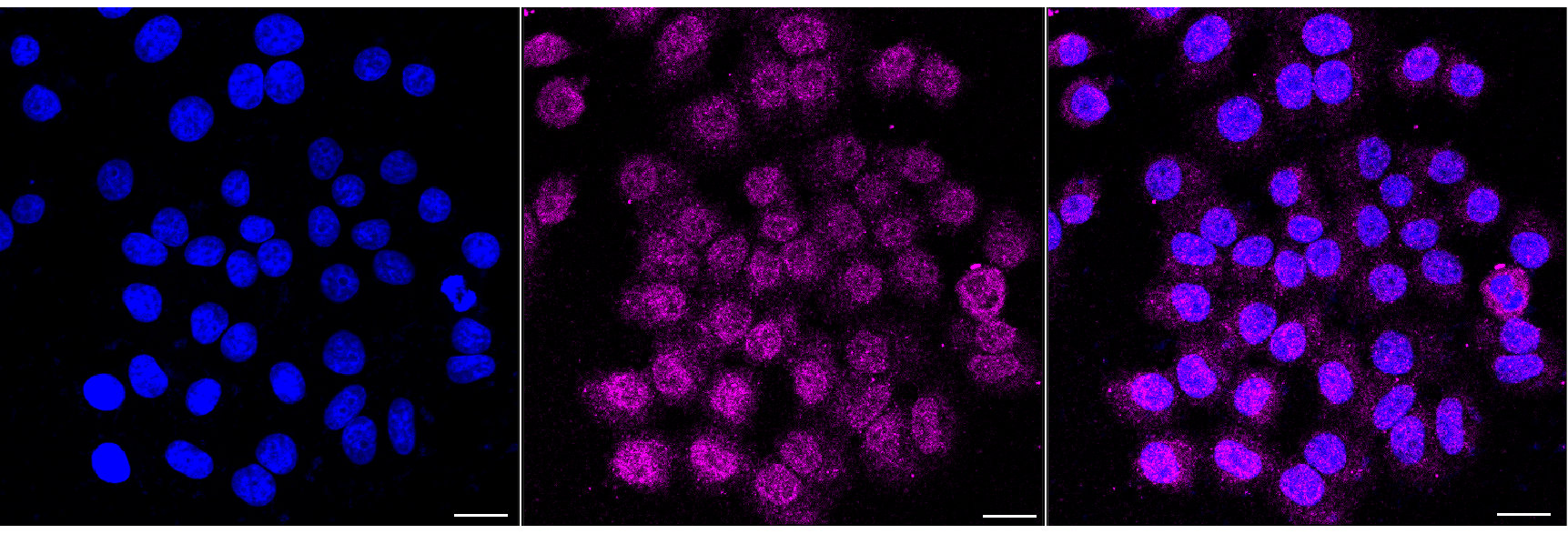 Immunocytochemical staining of HepG2 cells with RNF40 antibody. Nuclei were stained blue with DAPI; RNF40 was stained magenta with Alexa Fluor? 647. Images were taken using Leica stellaris 5. Protein abundance based on laser Intensity and smart gain: Low. Scale bar, 20 μm.
