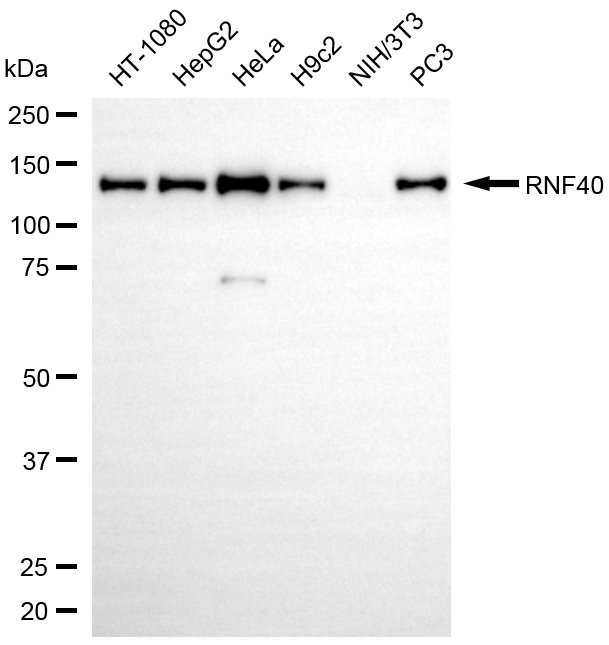 Western blotting analysis using RNF40 antibody. Total cell lysates (30 μg) from various cell lines were loaded and separated by SDS-PAGE. The blot was incubated with RNF40 antibody and HRP-conjugated goat anti-rabbit secondary antibody respectively.