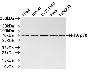 Positive WB detected in: K562 whole cell lysate(20μg),Jurkat whole cell lysate(20μg),U-251MG whole cell lysate(20μg),Hela whole cell lysate(20μg),HEK293 whole cell lysate(20μg)