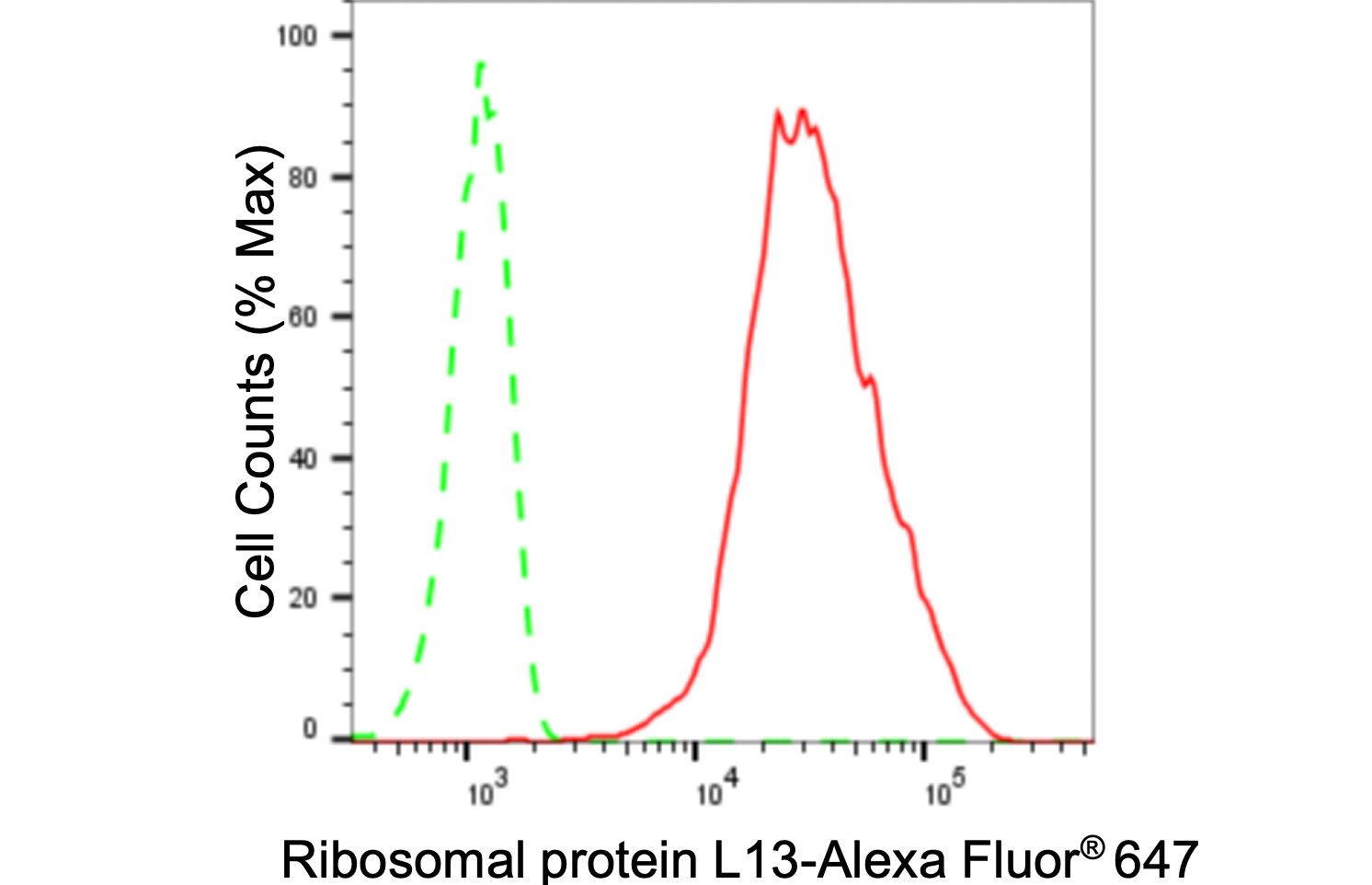 Flow cytometric analysis of Ribosomal protein L13 expression in C2C12 cells using Ribosomal protein L13 antibody. Green, isotype control; red, Ribosomal protein L13.