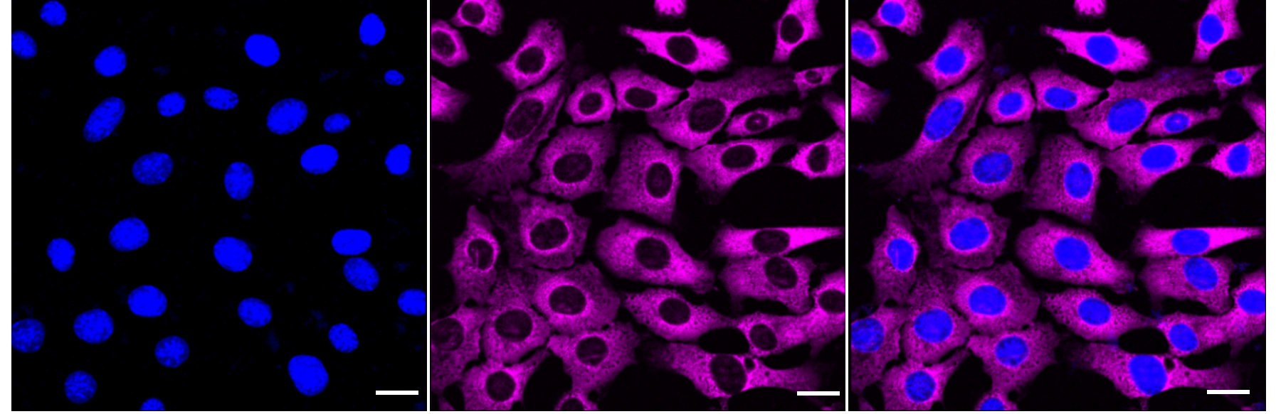 Immunocytochemical staining of C2C12 cells with Ribosomal protein L13 antibody. Nuclei were stained blue with DAPI; Ribosomal protein L13 was stained magenta with Alexa Fluor? 647. Images were taken using Leica stellaris 5. Protein abundance based on laser Intensity and smart gain: High. Scale bar: 20 μm.