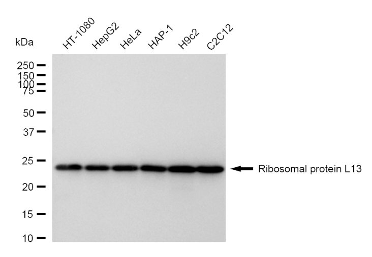 Western blotting analysis using Ribosomal protein L13 antibody. Total cell lysates (30 μg) from various cell lines were loaded and separated by SDS-PAGE. The blot was incubated with Ribosomal protein L13 antibody and HRP-conjugated goat anti-rabbit secondary antibody respectively.