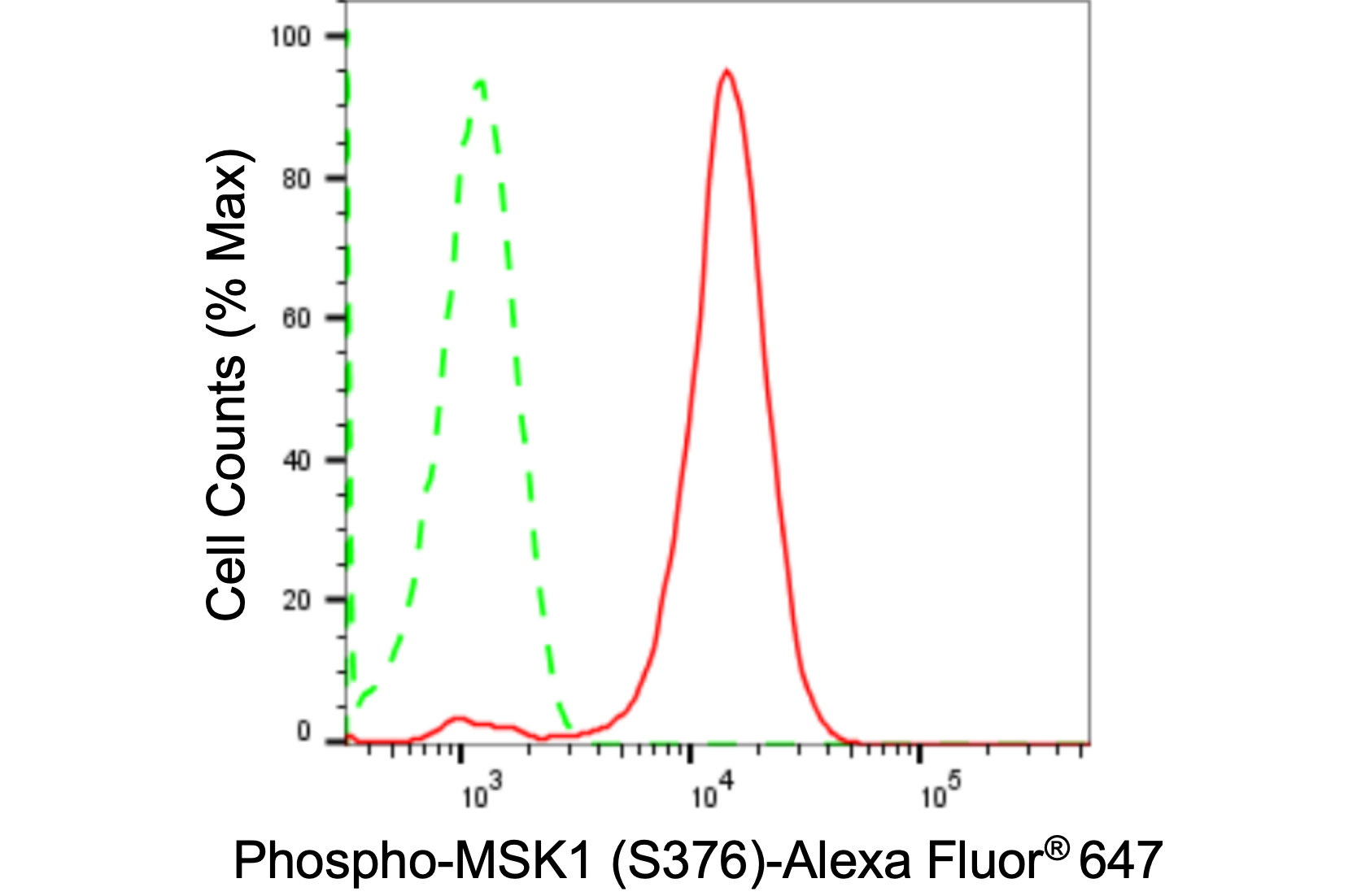 Flow cytometric analysis of Phospho-MSK1 (S376) expression in H9c2 cells using Phospho-MSK1 (S376) antibody. Green, isotype control; red, Phospho-MSK1 (S376).
