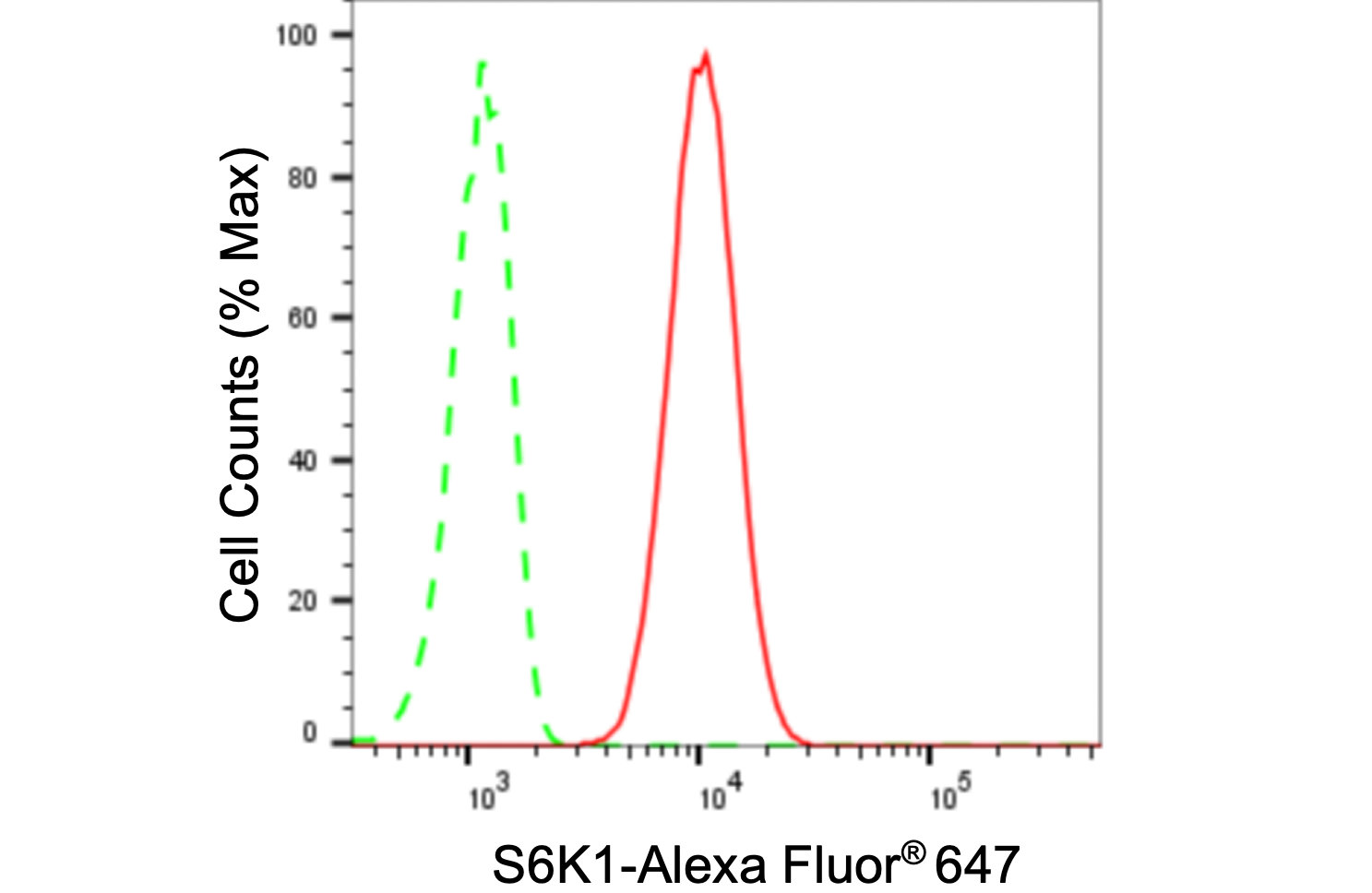 Flow cytometric analysis of S6K1 expression in C2C12 cells using S6K1 antibody. Green, isotype control; red, S6K1.