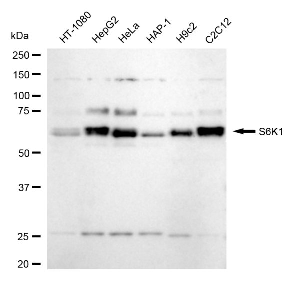 Western blotting analysis using S6K1 antibody. Total cell lysates (30 μg) from various cell lines were loaded and separated by SDS-PAGE. The blot was incubated with S6K1 antibody and HRP-conjugated goat anti-rabbit secondary antibody respectively.