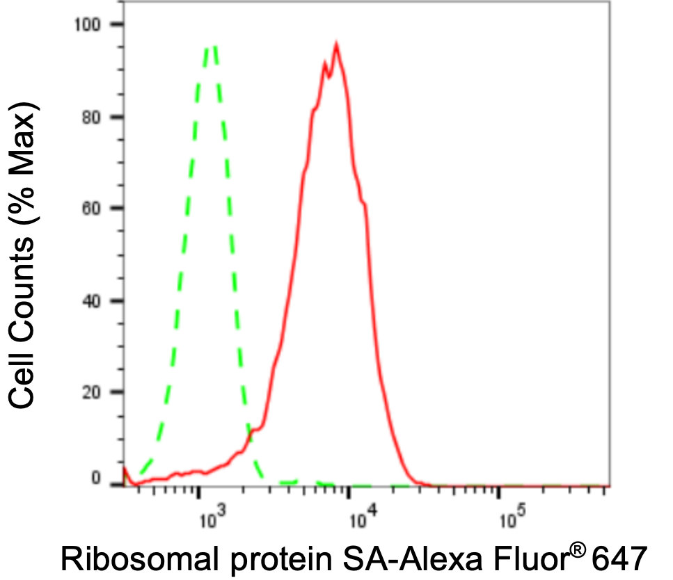 Flow cytometric analysis of Ribosomal protein SA expression in HepG2 cells using Ribosomal protein SA antibody. Green, isotype control; red, Ribosomal protein SA.