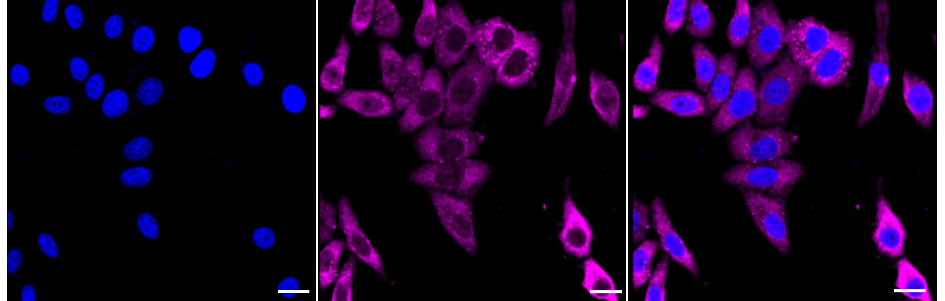 Immunocytochemical staining of HepG2 cells with Ribosomal protein SA antibody. Nuclei were stained blue with DAPI; Ribosomal protein SA was stained magenta with Alexa Fluor? 647. Images were taken using Leica stellaris 5. Protein abundance based on laser Intensity and smart gain: Medium. Scale bar: 20 μm.