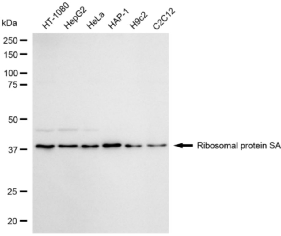 Western blotting analysis using Ribosomal protein SA antibody. Total cell lysates (30 μg) from various cell lines were loaded and separated by SDS-PAGE. The blot was incubated with Ribosomal protein SA antibody and HRP-conjugated goat anti-rabbit secondary antibody respectively.