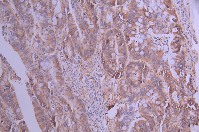 IHC image of CSB-RA786202A0HU diluted at 1:100 and staining in paraffin-embedded human colorectal cancer performed on a Leica BondTM system. After dewaxing and hydration, antigen retrieval was mediated by high pressure in a citrate buffer (pH 6.0). Section was blocked with 10% normal goat serum 30min at RT. Then primary antibody (1% BSA) was incubated at 4°C overnight. The primary is detected by a Goat anti-rabbit polymer IgG labeled by HRP and visualized using 0.05% DAB.