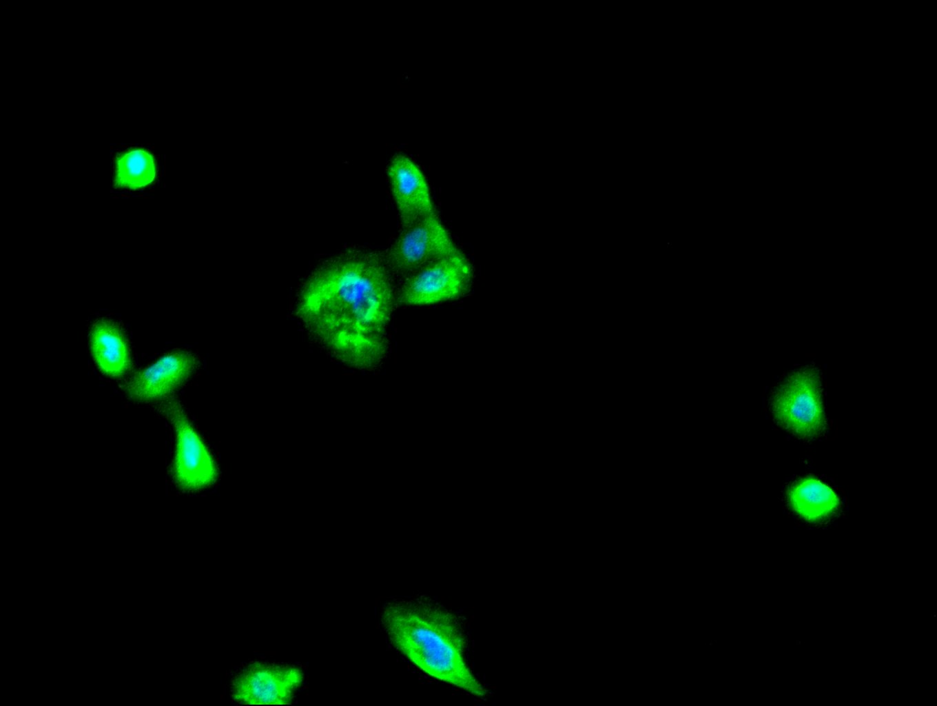 Immunofluorescence staining of A-431 cell with CSB-RA278193A0HU at 1:50, counter-stained with DAPI. The cells were fixed in 4% formaldehyde, permeabilized using 0.2% Triton X-100 and blocked in 10% normal Goat Serum. The cells were then incubated with the antibody overnight at 4°C. The secondary antibody was Alexa Fluor 488-congugated AffiniPure Goat Anti-Rabbit IgG(H+L).
