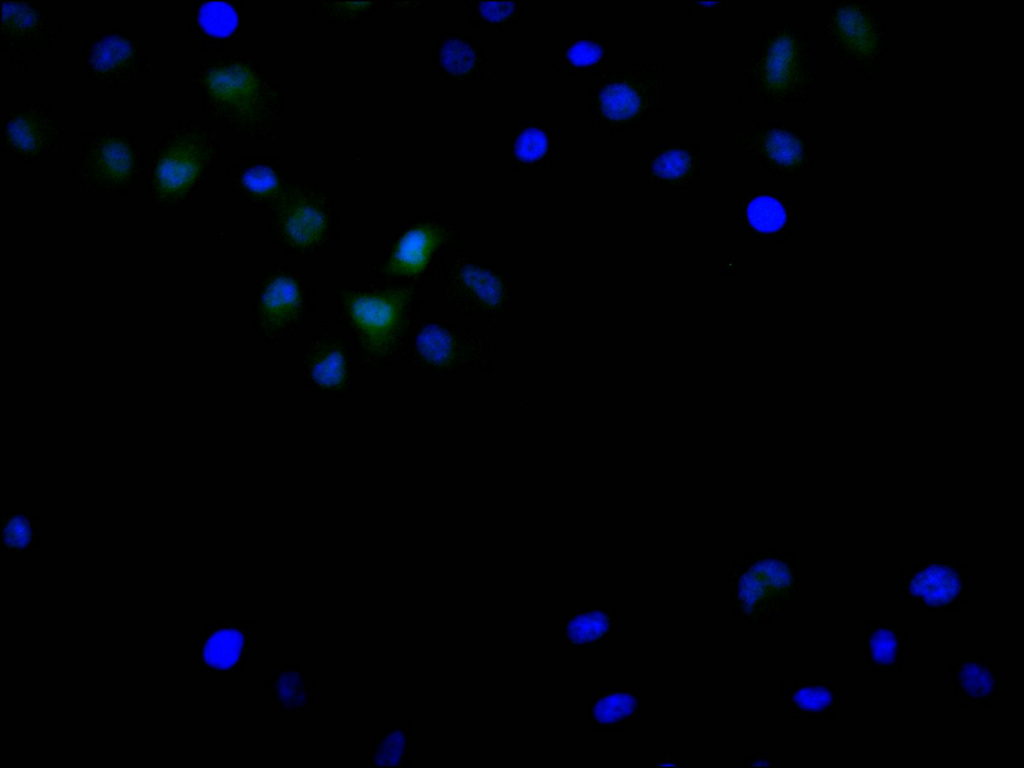 Immunofluorescence staining of Hela cell with CSB-RA240912A0HU at 1:50, counter-stained with DAPI. The cells were fixed in 4% formaldehyde, permeabilized using 0.2% Triton X-100 and blocked in 10% normal Goat Serum. The cells were then incubated with the antibody overnight at 4°C. The secondary antibody was Alexa Fluor 488-congugated AffiniPure Goat Anti-Rabbit IgG(H+L).