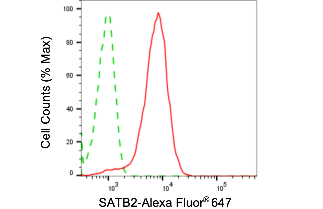 Flow cytometric analysis of SATB2 expression in HeLa cells using SATB2 antibody. Green, isotype control; red, SATB2.