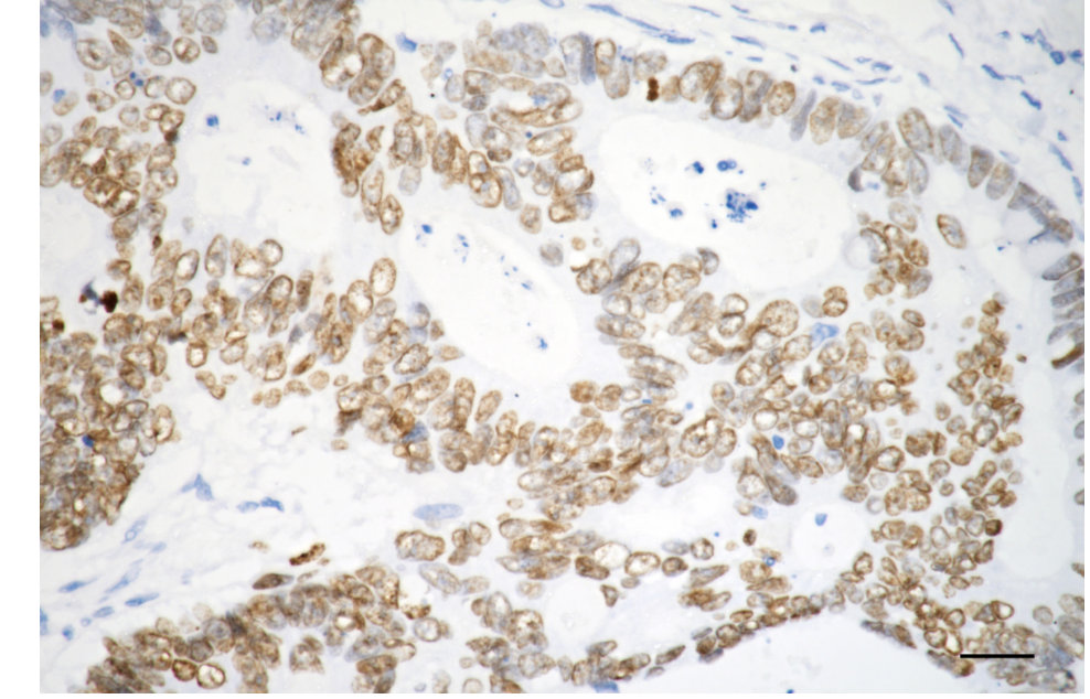 Immunohistochemistry was performed on paraffin-embedded human sigmoid colon carcinoma using SATB2 antibody. Antigen retrieval was done in sodium citrate buffer (pH 6.0). DAB was used for detection, with hematoxylin counterstaining. Images were acquired using a Nikon Ci-L Plus microscope (40× objective). Scale bar: 25 μm.