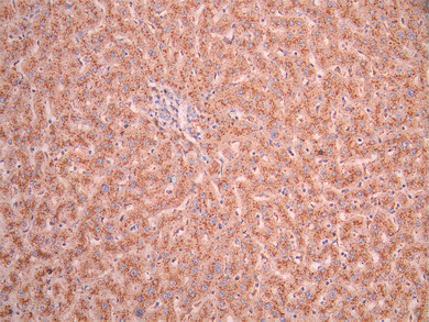 IHC image of CSB-RA203929A0HU diluted at 1:100 and staining in paraffin-embedded human liver tissue performed on a Leica BondTM system. After dewaxing and hydration, antigen retrieval was mediated by high pressure in a citrate buffer (pH 6.0). Section was blocked with 10% normal goat serum 30min at RT. Then primary antibody (1% BSA) was incubated at 4°C overnight. The primary is detected by a Goat anti-rabbit polymer IgG labeled by HRP and visualized using 0.05% DAB.